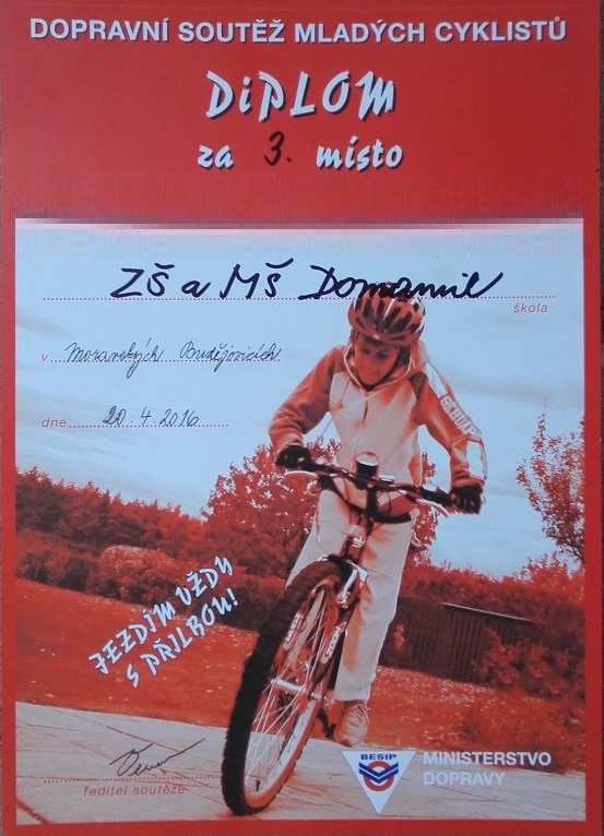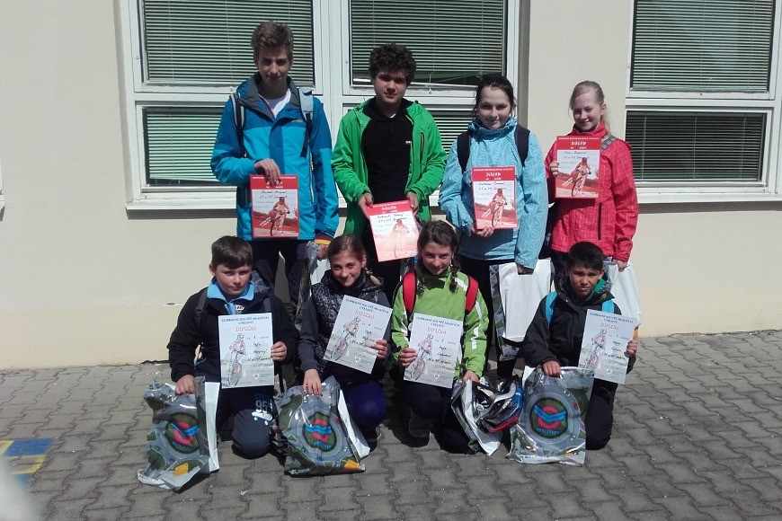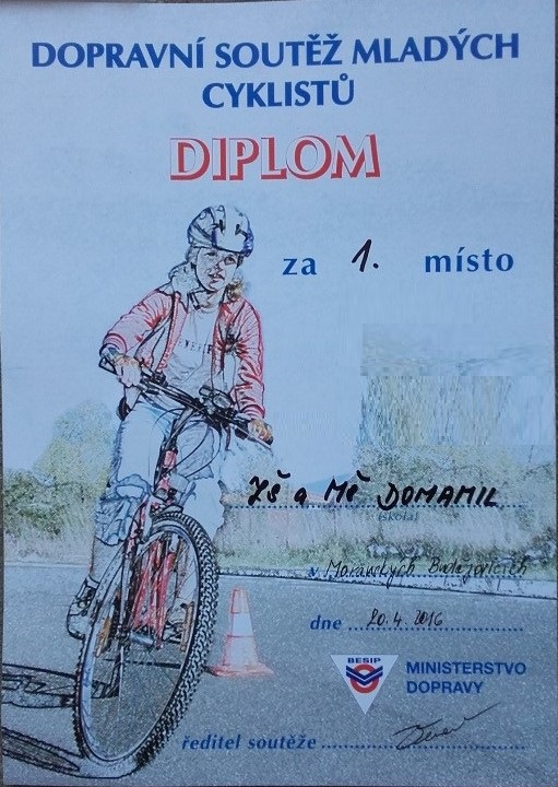 Ve středu 20. dubna 2016 jsme se zúčastnili oblastního kola Dopravní soutěže mladých cyklistů v Moravských Budějovicích. Soutěž se skládala ze 4 disciplín: test z pravidel silničního provozu, poskytování první pomoci, jízda zručnosti přes překážky a jízda po dopravním hřišti. Ze školního kola v kategorii starší postoupili: Sára Bajerová, Katka Švecová, Bohumil Pokorný a Radek Roupec. Za mladší žáky reprezentovali naši školu: Hana Svobodová, Nela Bajerová, Adam Špinka a Petr Novotný. Po sečtení trestných bodů byly vyhlášeny celkové výsledky, které nás velice potěšily. Starší žáci skončili na třetím místě a mladší vybojovali krásné první místo!!! Obě družstva postoupila do okresního kola, které se uskuteční v květnu v Náměšti nad Oslavou.