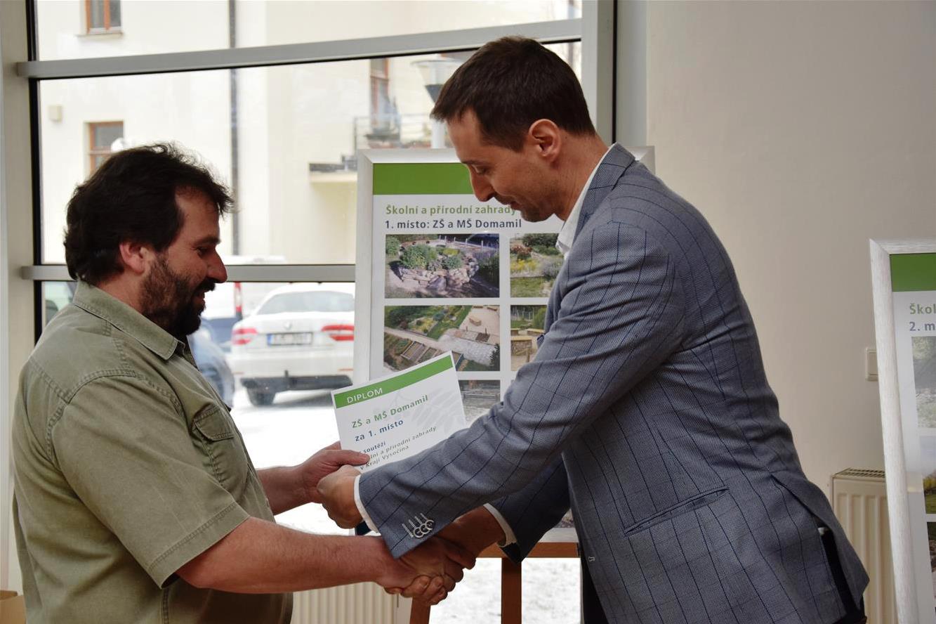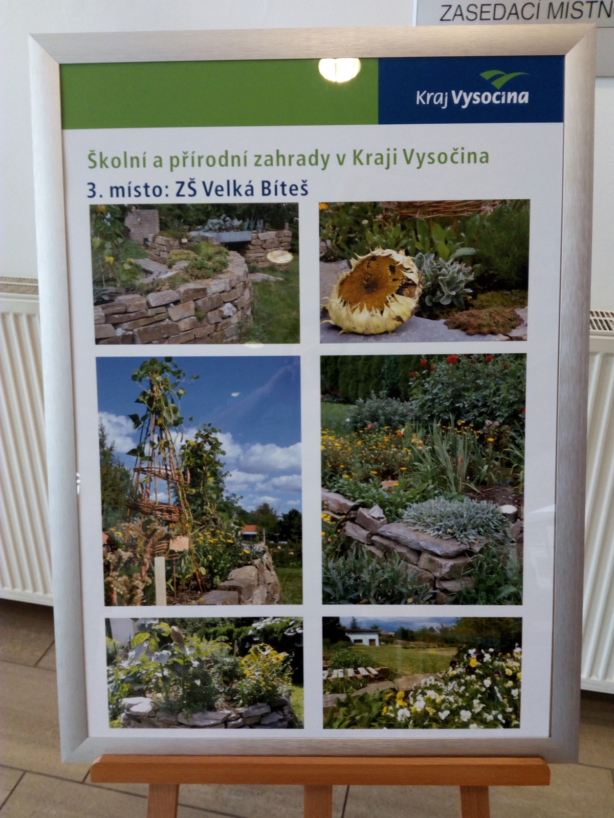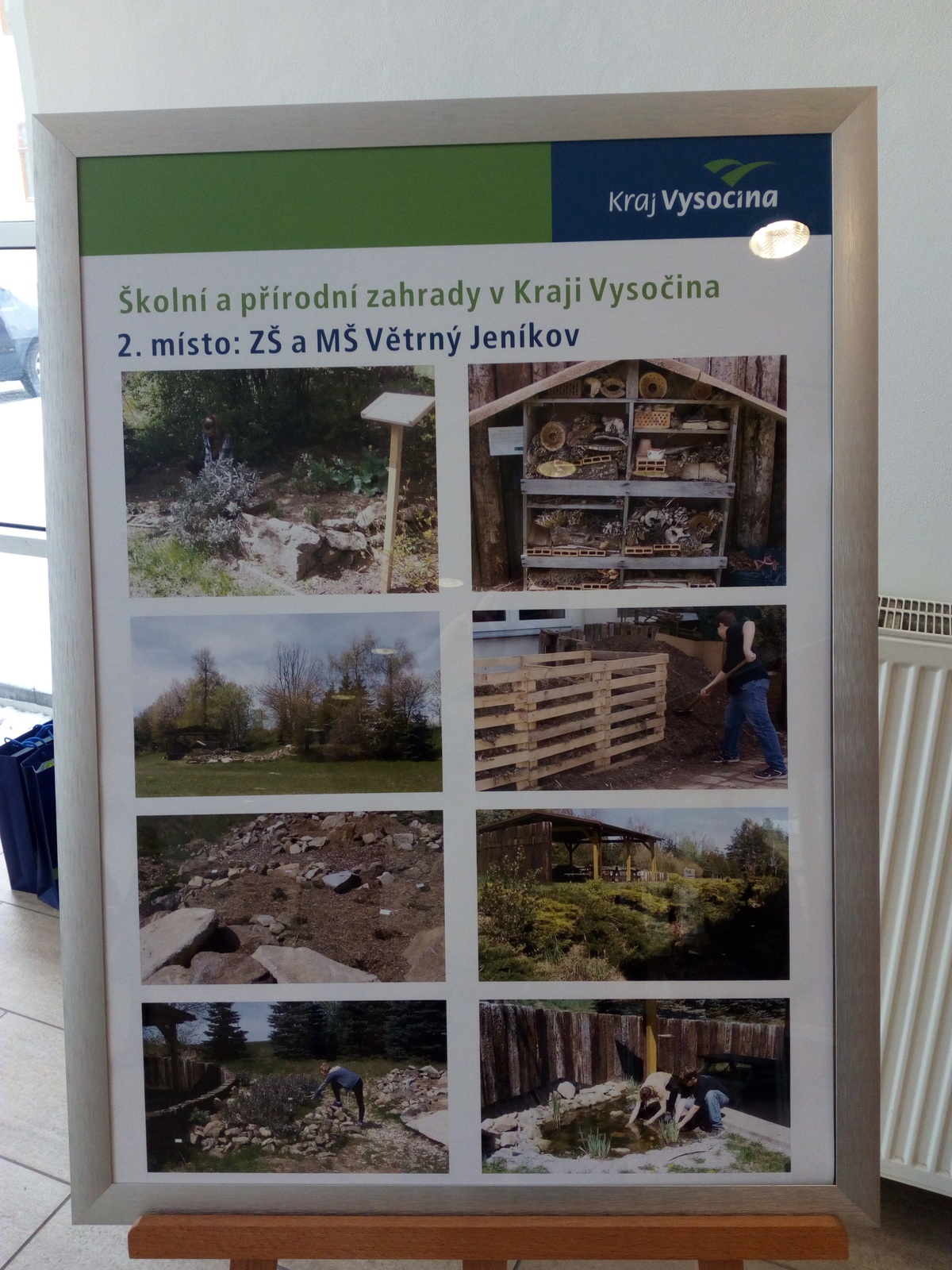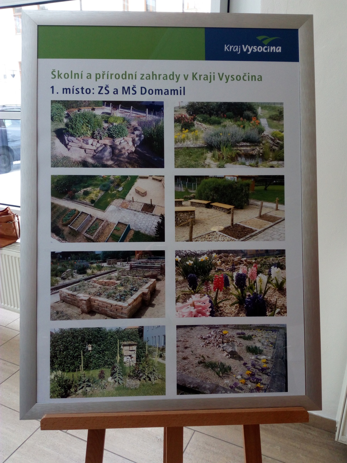 Na Krajském úřadě v Jihlavě se v pondělí 5. března 2018 uskutečnila vernisáž výstavy Přírodní a školní zahrady v Kraji Vysočina. K vidění byly fotografie Ukázkových přírodních zahrad, prezentace jedlých květů, výstavka a ochutnávka různých odrůd jablek. V průběhu vernisáže vyhlásil krajský radní pro oblast životního prostředí a zemědělství Martin Hyský vítěze soutěže o nejhezčí školní zahradu. A první místo v této soutěži získala naše přírodní zahrada z Domamile. S oceněním byly spojeny i věcné ceny: publikace ze SEV Chaloupky, krabice semínek od společnosti SEMO, srážkoměry a velké plátno s fotografií naší zahrady.