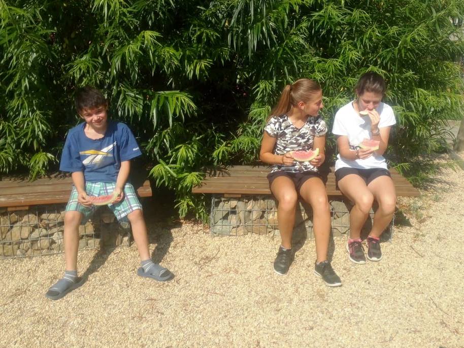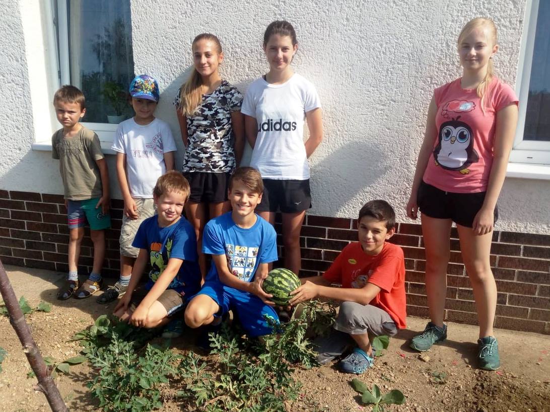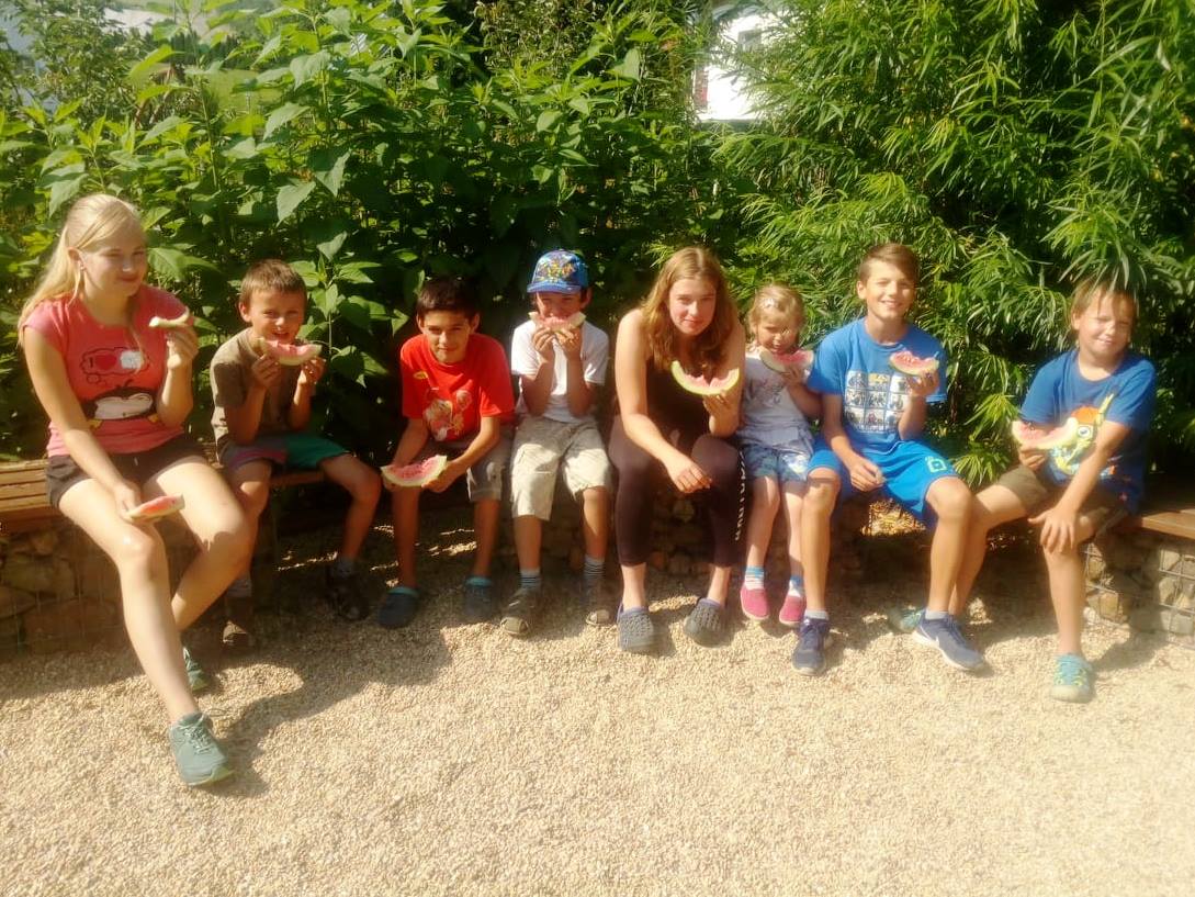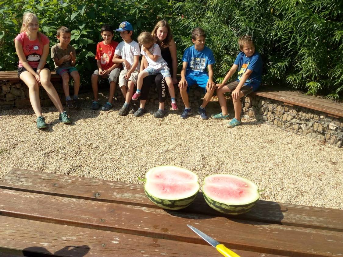 Žáci chodí dobrovolně na přírodní zahradu i o prázdninách. Sklízí tady zralou zeleninu, vytrhávají velký plevel, aby nevysemenil, nebo doplňují vodu v jezírku. V pondělí 30. července čekala na malé brigádníky příjemná odměna. I přes sucho nám na naší zahradě vyrostl a dozrál letos meloun. Po skončení práce jsme ho s chutí všichni snědli.