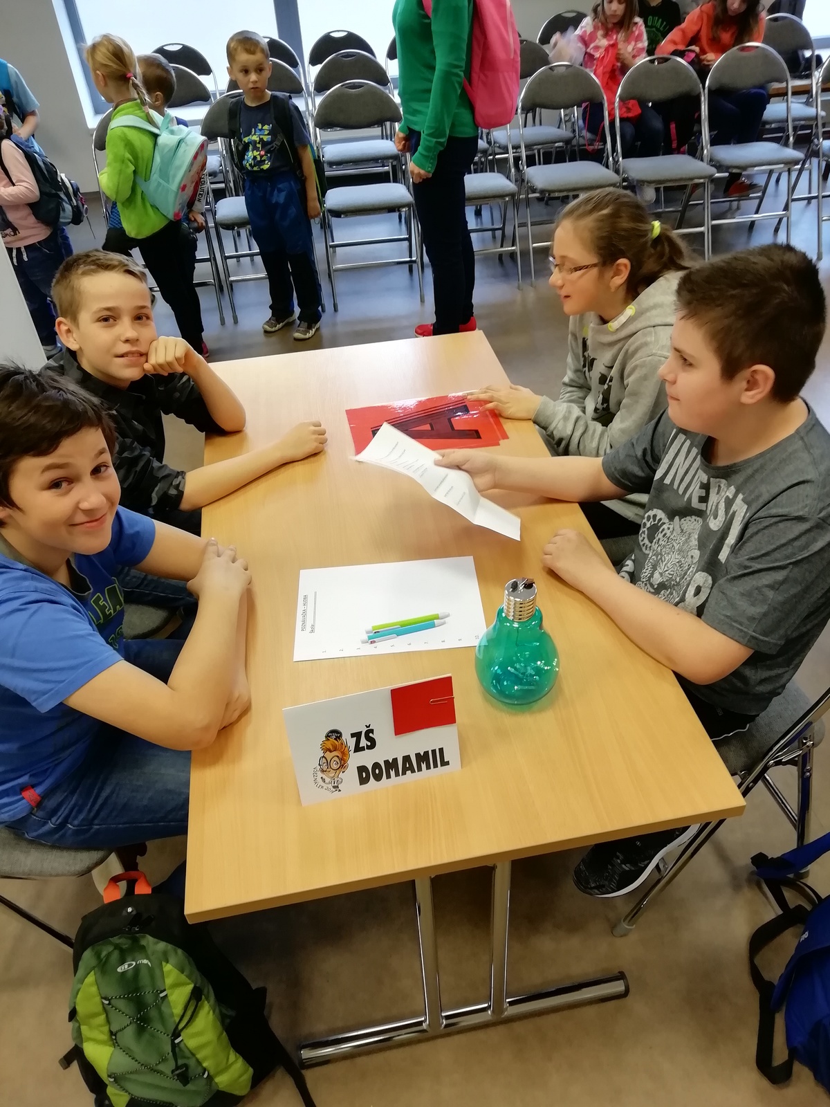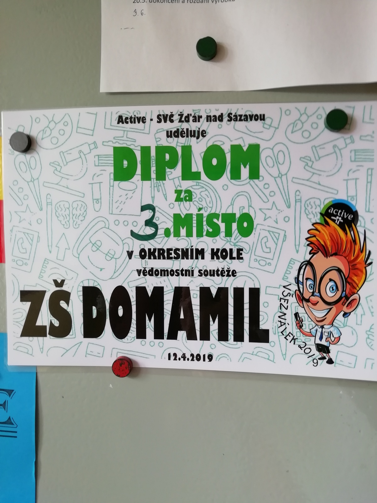 V pátek 12. dubna se čtyřčlenný tým žáků 5. ročníku zúčastnil okresního kola vědomostní soutěže Všeználek v DDM Třebíč. Děti odpovídaly na otázky různých obtížností z oblasti literatury, dějin, zeměpisu, matematiky, ale také hudební výchovy nebo sportu. Celkem bylo připraveno 72 otázek, které byly rozděleny třemi mezihrami. Kamča, Vašek, Marek i Milan si vedli velice dobře a vybojovali 3. místo.