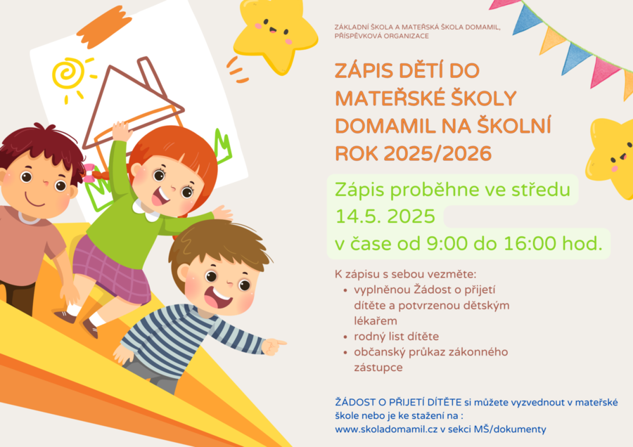 Úvod > Mateřská škola > Novinky MŠ > ZÁPIS DĚTÍ DO MATEŘSKÉ ŠKOLY DOMAMIL NA ŠKOLNÍ ROK 2025/2026