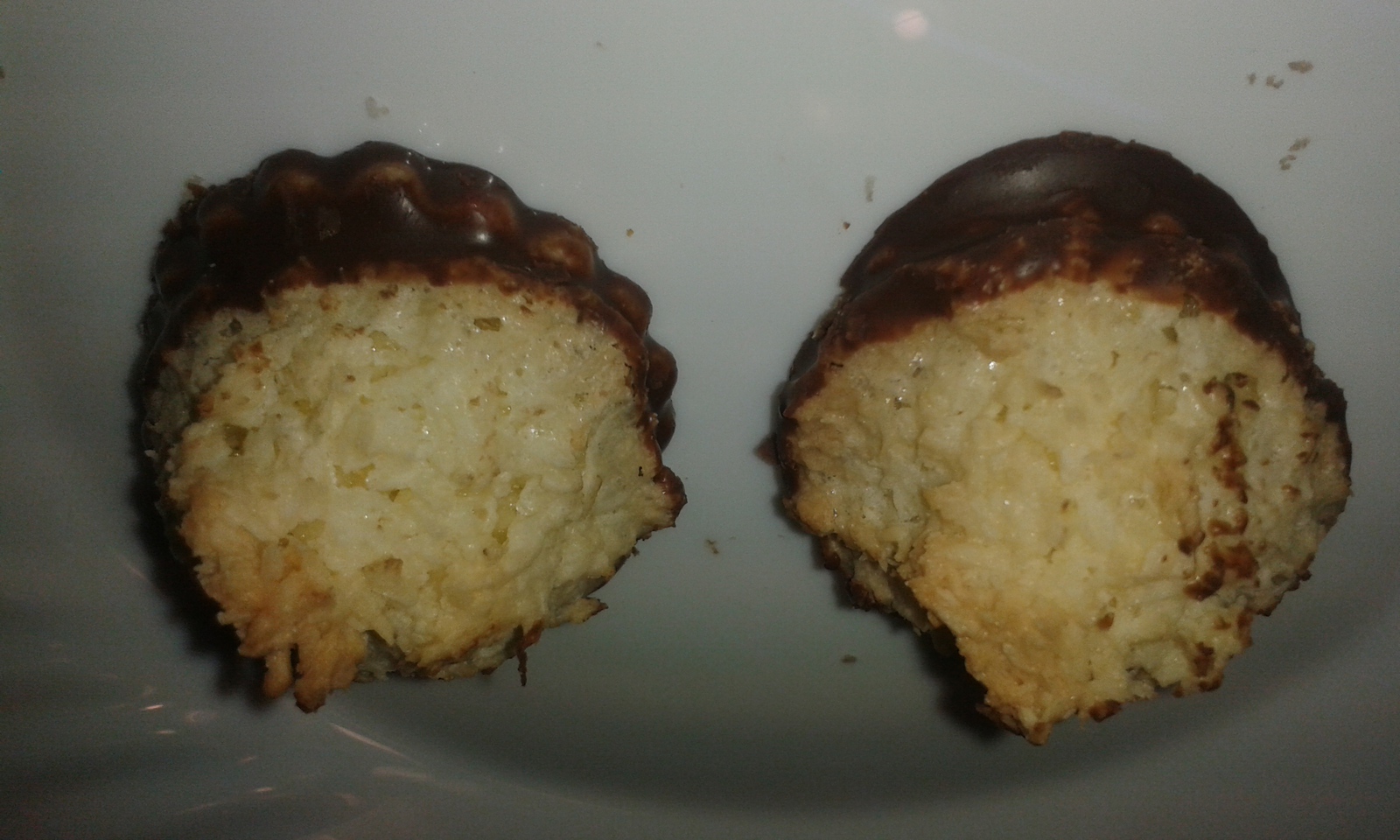 250 g kokosu, 250 g práškového cukru, 3 vejce - smícháme, tvoříme malé hromádky na pečící papír a pečeme na 150°C. Vychladlé lepíme marmeládou na linecká kolečka a spodní část máčíme v rozehřáté čokoládě.