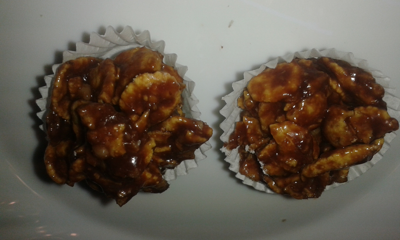 8 lžic medu (rovné), 10 lžic krystalového cukru - rozpustíme nad párou ve vodní lázni + 250 g másla + 100 g hořké čokolády - mícháme dohladka + 100 g nasekaných ořechů + 300 g lupínků - vše řádně zamícháme. Ještě teplé nabíráme lžičkou a klademe do košíčků. Necháme ztuhnout.