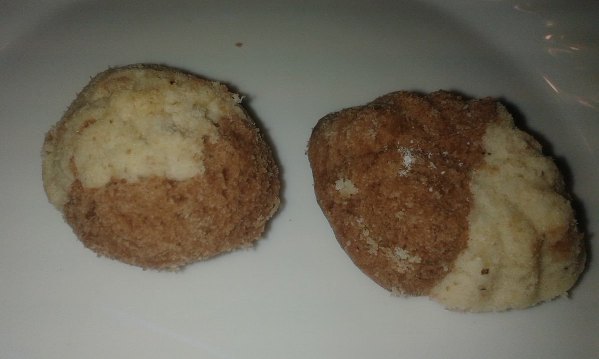 400 g hladké mouky, 400 g cukru, 300 g sádla, 100 g mletých ořechů - vypracujeme těsto, rozdělíme na dva stejné díly a jeden díl obarvíme kakaem. Plníme do menších formiček - 1/2 bílého a 1/2 tmavého těsta. Upečeme na 180°C, necháme vychladnout a vyklopíme.