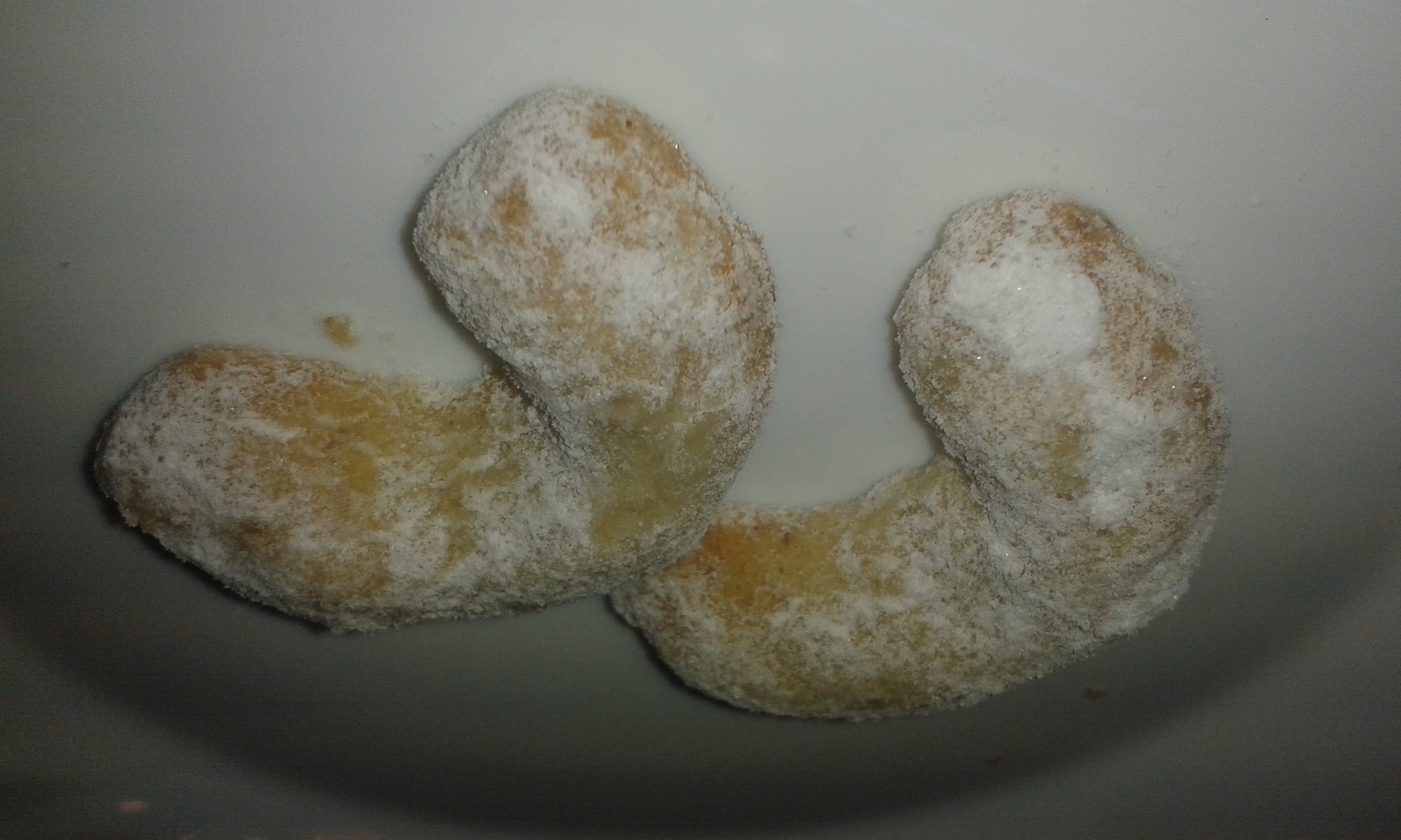 450 g hladké mouky, 140 g moučkového cukru, 140 g mletých ořechů, 420 g másla (tuku), trochu skořice. Těsto zpracujeme, necháme několik hodin odležet, pak vyválíme válečky, které tvrarujeme do rohlíčků. Upečené obalujeme v cukru smíchaném s vanilkovým cukrem.